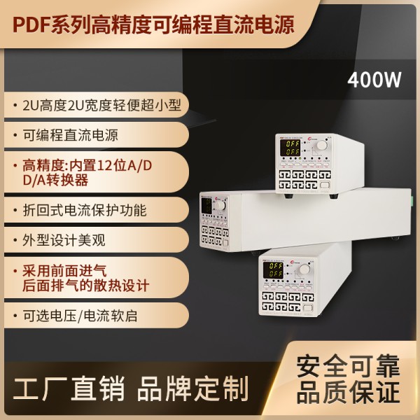 PDF系列寬范圍高精度可編程直流電源由高效芯片控制,具有高效能,高精度,高穩(wěn)定性等特性,配備多種輔助功能,體積輕巧,讓用戶使用更方便、可靠。 關于PDF系列400W,600W,800W,1000W,1200W,1600W,2000W,2400W具有同類產品*寬的電壓,電流及使用率,該產品大大提高了應用范圍。以PDF400-30 為例,400W的功率,輸出值,在30V/40A 內可調,自動控制,電壓和電流的變化率,功率比達到三倍之多。電壓、電流設定組合可以實現(xiàn)4倍率的恒功率型電源,一臺機器可替代以往30V×13A/10V×40A/20V×20A等多種機型,減少您的重復投資。而對于PDF系列2400W功率則提供了全功率等級使用范圍。